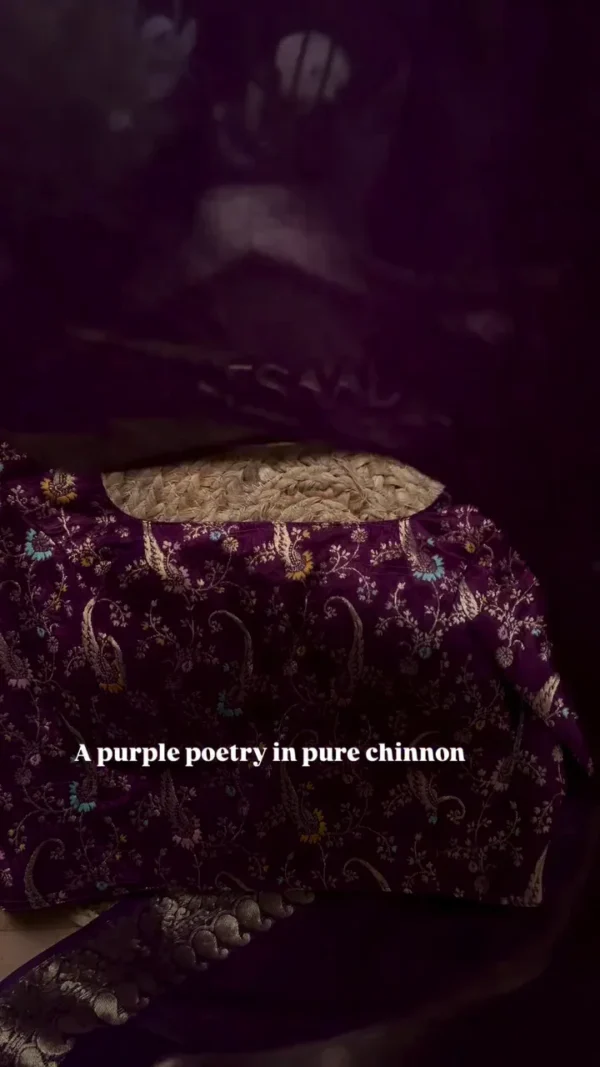 A pure chinnon purple jacquard and embroidery saree is a stunning choice for traditional and festive occasions. Here’s a brief description of this type of saree: