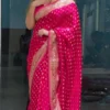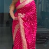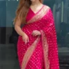 - Zari Work: Embellished with rich Zari weaving, the saree features golden and silver threads that lend a shimmering, royal touch to the design.