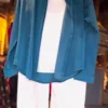 ✔ Shirt: Teal satin button-up with a relaxed fit, long sleeves, and subtle sheen